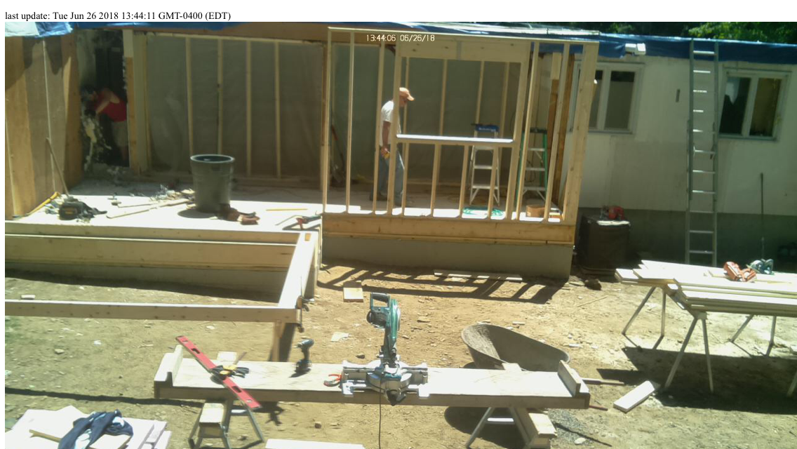 Meanwhile, here at the homestead, the guys are preparing for rain. The plan for the day was to do a minimal amount of framing work and then to make sure that everything was buttoned up tight against the rain…. Oh yes, and the electrician came and hooked up the power for the AC.