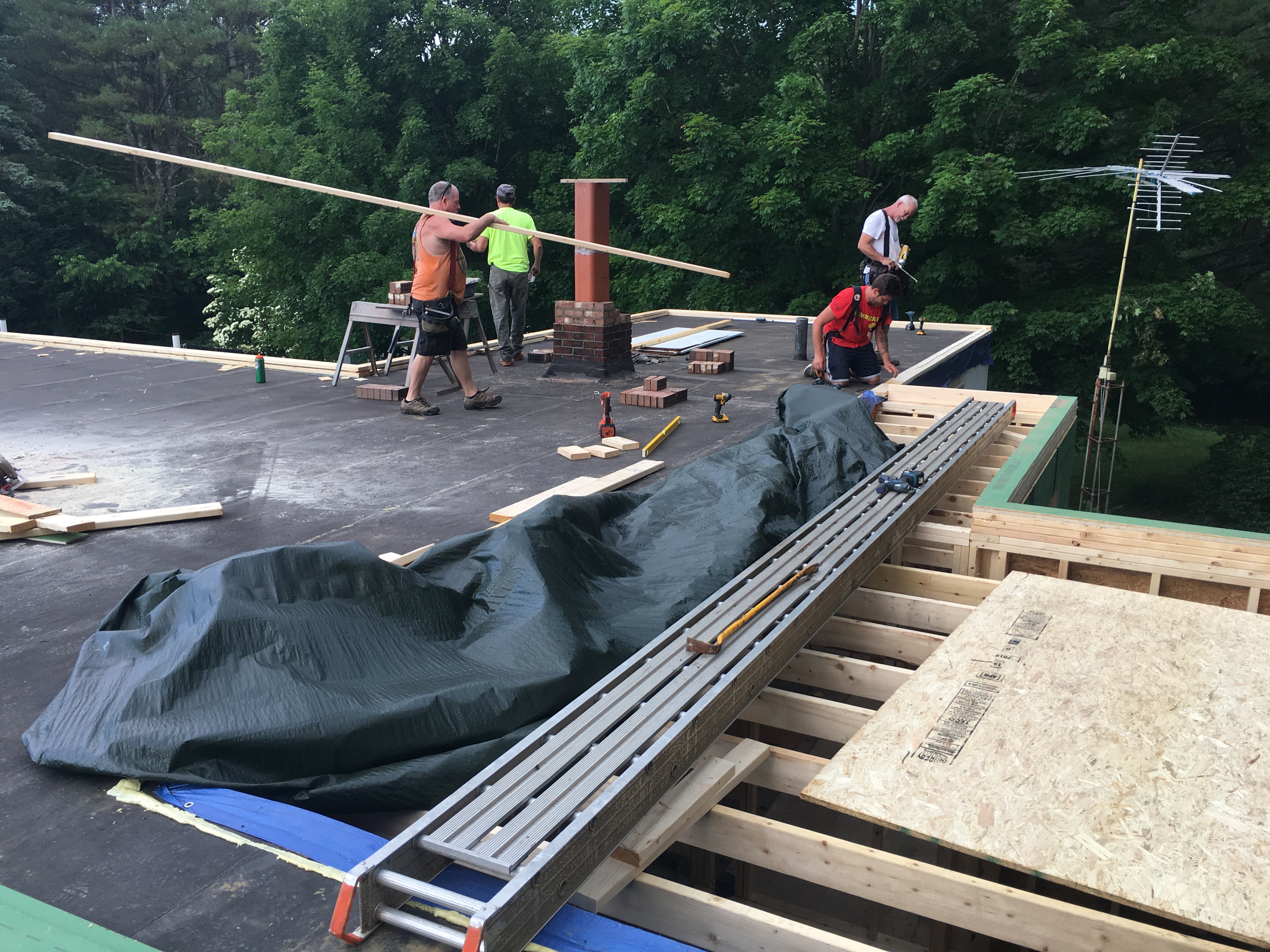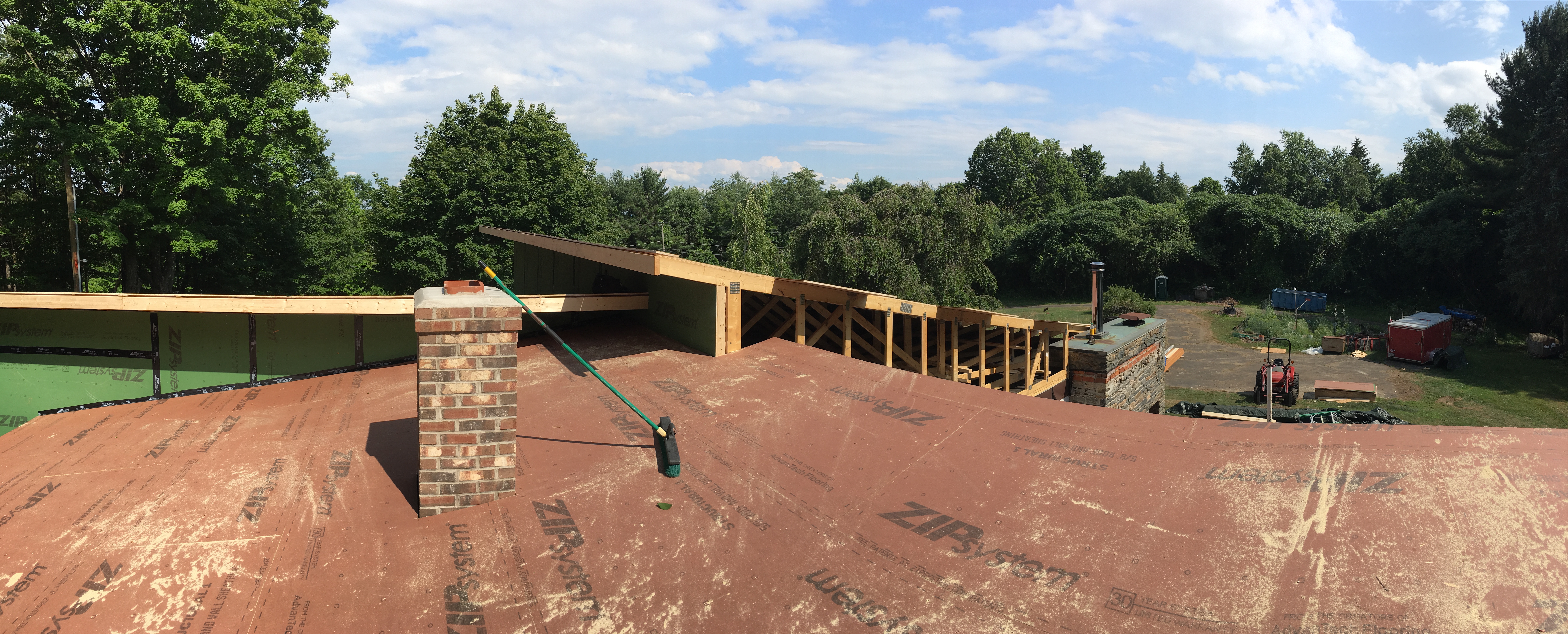 At the end of the day, the three roof sections are covered for the first time (and you can see our newly extended chimney).