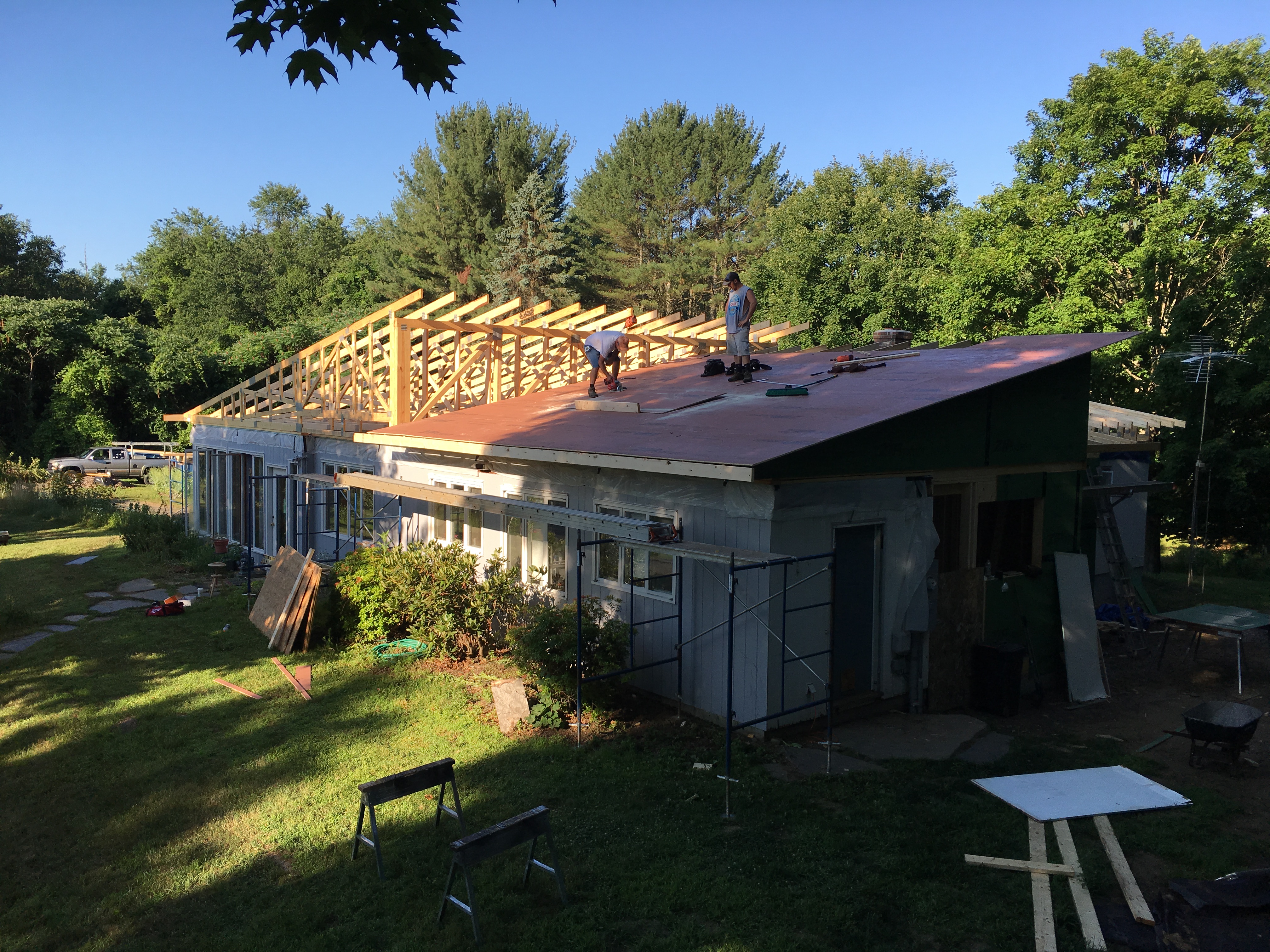 View from the south shows the living room trusses, and part of the bedroom trusses to the left.