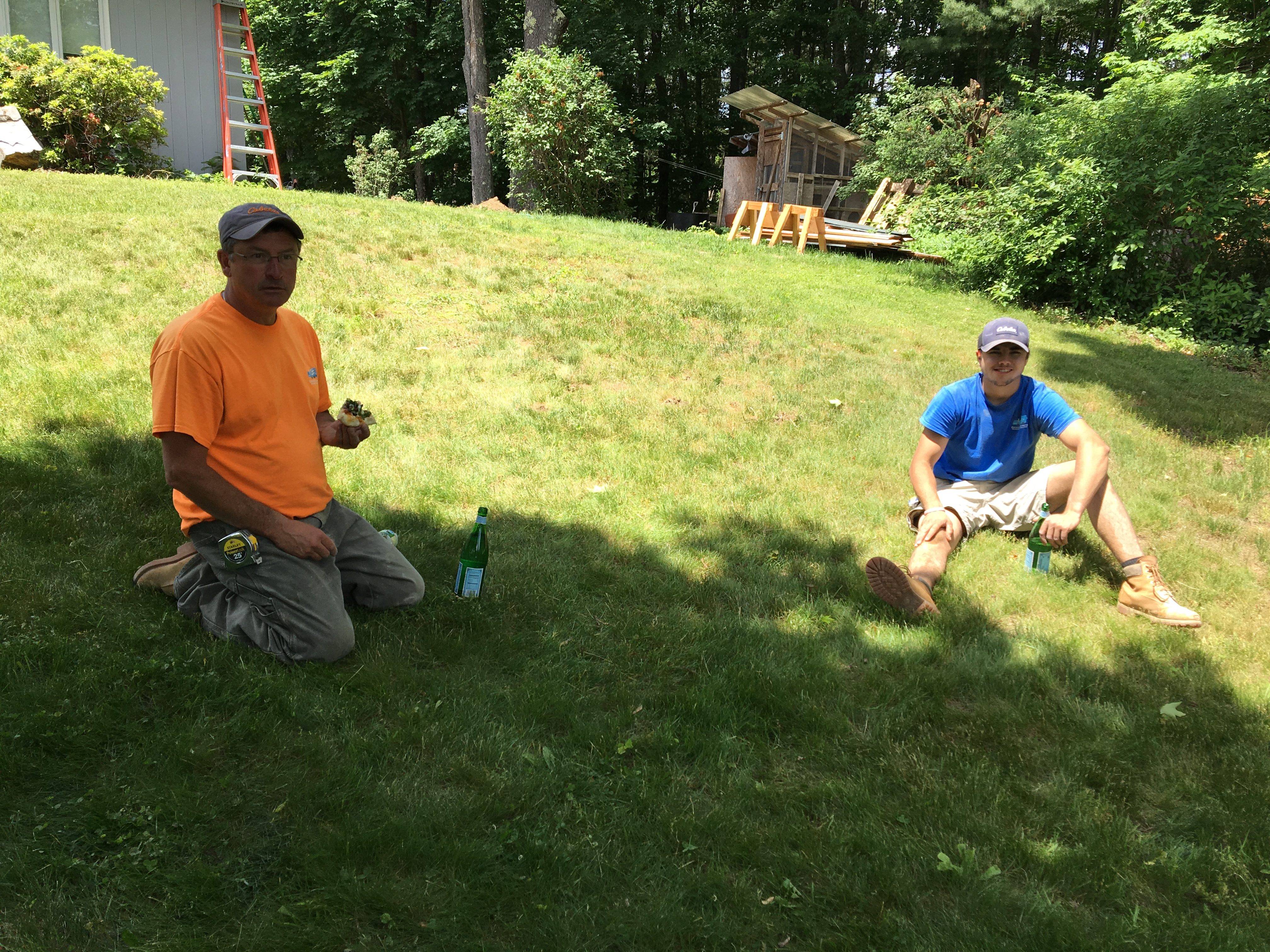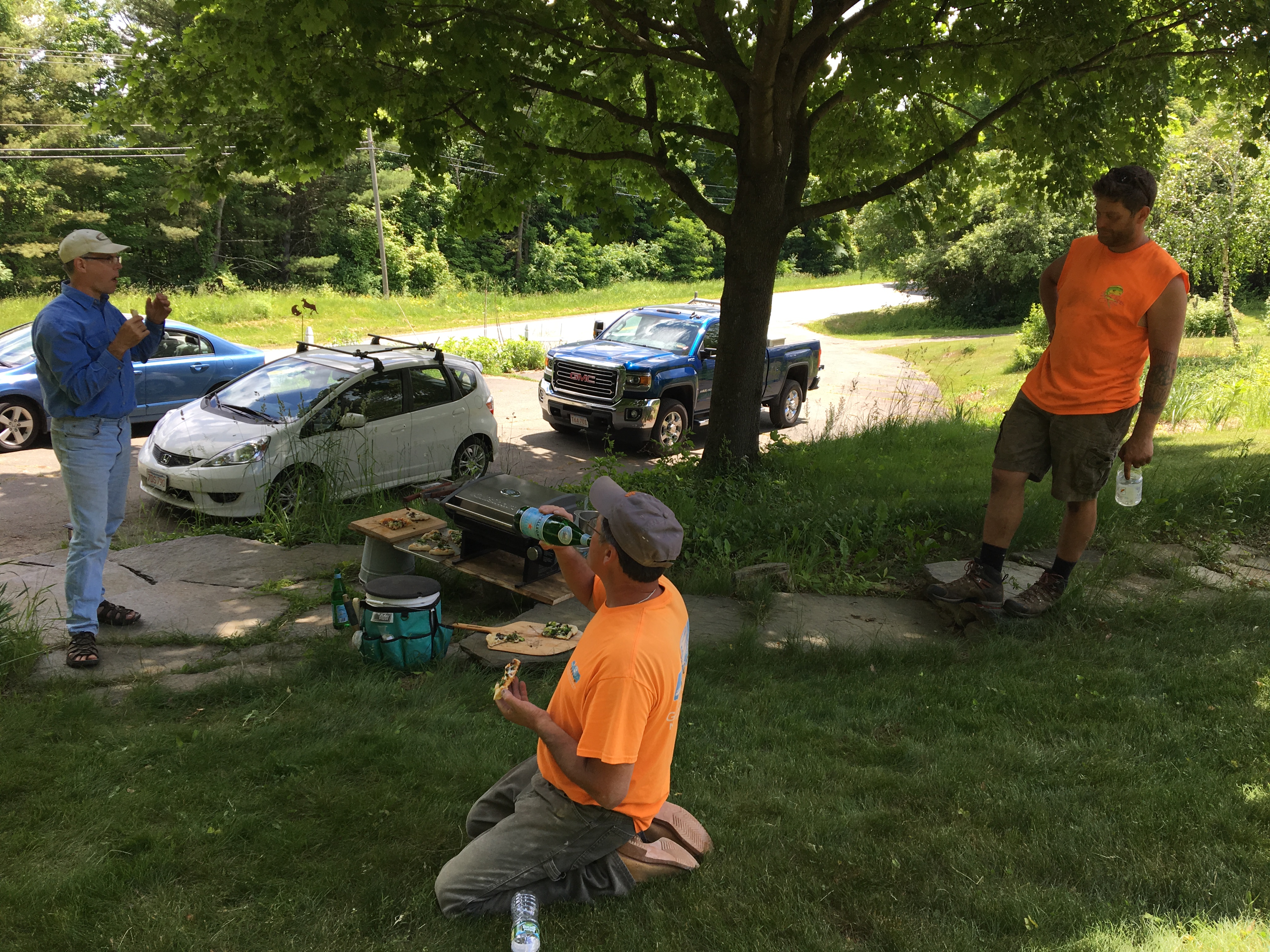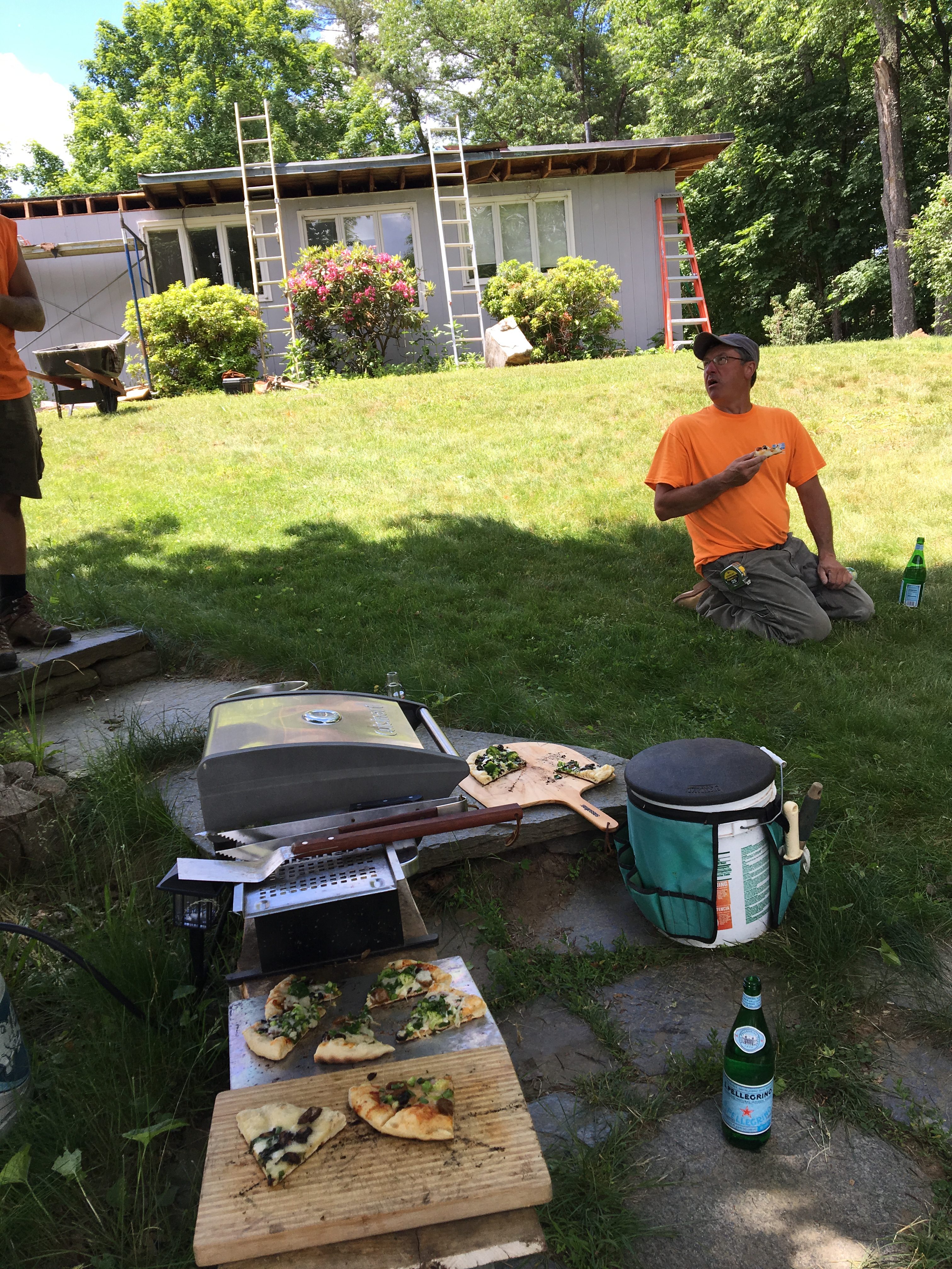 We made pizza on the grill for the guys today. Yum. …. and, while they guys weren’t eating pizza, the foundation wall was built and the roof overhangs on the east side were cut off. Yay.